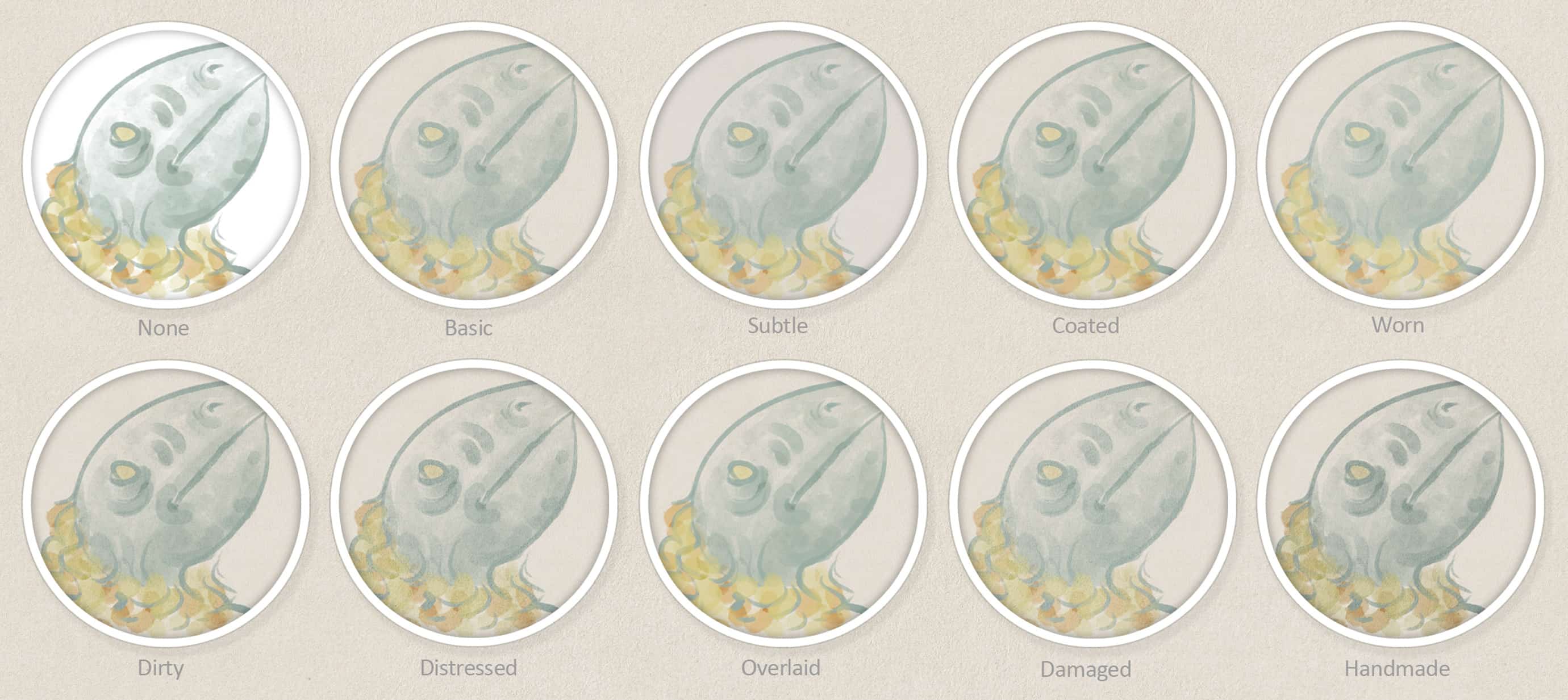This is an example of what the Art Surface looks like in Photoshop with a painting on it. Each circle shows a different Smart Surface setting applied. The background is the same paper texture at 100% magnification