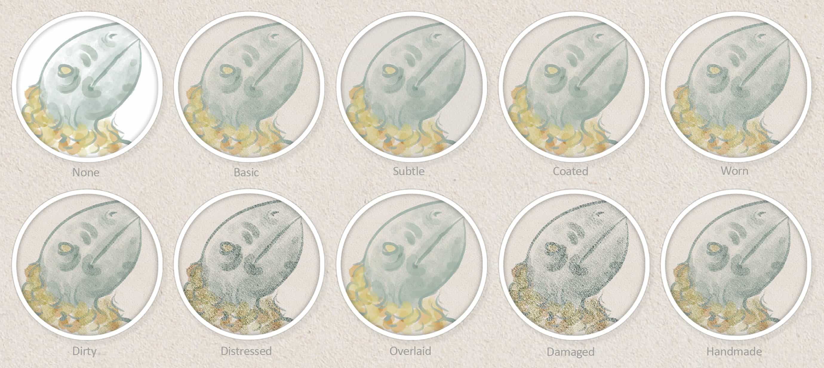 This is an example of what the Art Surface looks like in Photoshop with a painting on it. Each circle shows a different Smart Surface setting applied. The background is the same paper texture at 100% magnification