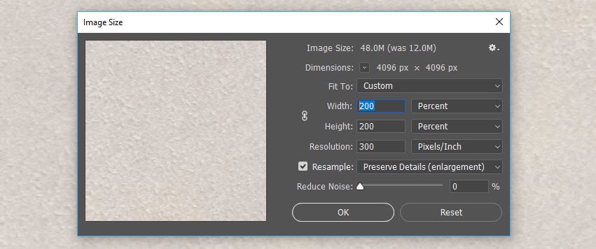 How to increase the dpi to 600 dpi (reduces size of grain as well and not recommended for tiling more than 4 to 5 times)