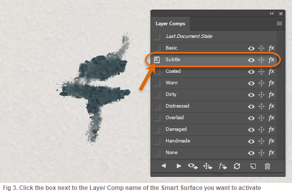 Each Photoshop Art Surface comes with 4 to 10 Smart Surface settings which are available in the Layer Comps Panel (Open it from the menu: Window > Layer Comps)
