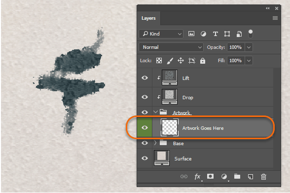 To jump right in, open the PSD file in Photoshop and start painting in the green layer titled “Artwork Goes Here”