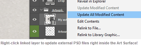 - Method 2: Embed an external file into the Art Surface. In Photoshop, Select File > Place Linked to embed another file, even a PSD file into the ‘Artwork’ layer folder. If you use Place Linked you can always edit the original file and just update the layer to refresh it