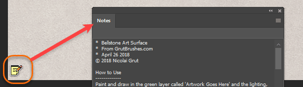 In the bottom left corner of every Art Surface is a little Photoshop note which can be opened by double-clicking on it. In it you will find some of the tips (like these) as well as the name of the Art Surface.