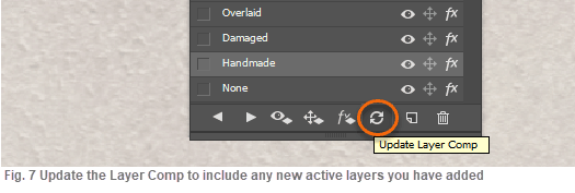 - Reactivate your new layer(s) and then click the Update Layer Comp button while your new layer is visible. The active Layer Comp (‘Handmade’ in fig. 7) will now include your new layers. You will have to do this once for each Layer Comp you switch to whenever you add new layers