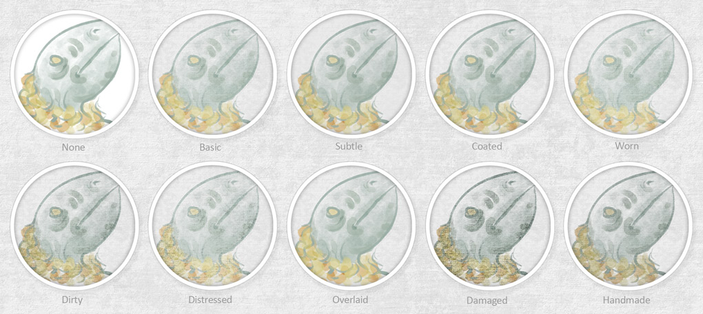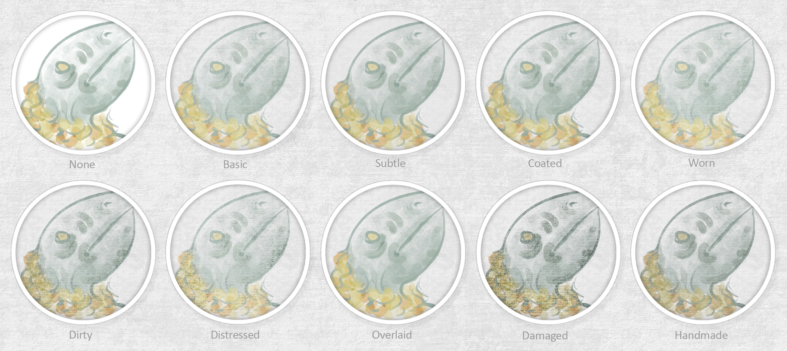This is an example of what the Art Surface looks like in Photoshop with a painting on it. Each circle shows a different Smart Surface setting applied. The background is the same paper texture at 100% magnification