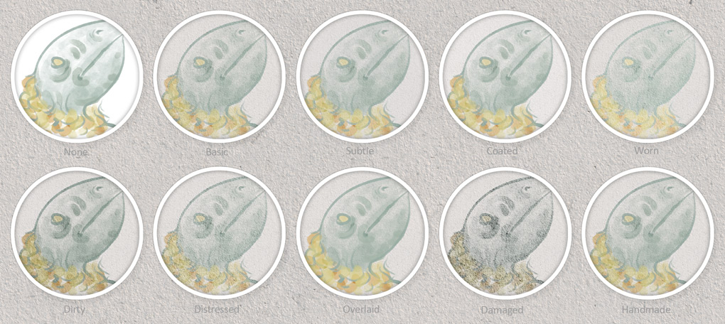 This is an example of what the Art Surface looks like in Photoshop with a painting on it. Each circle shows a different Smart Surface setting applied. The background is the same paper texture at 100% magnification