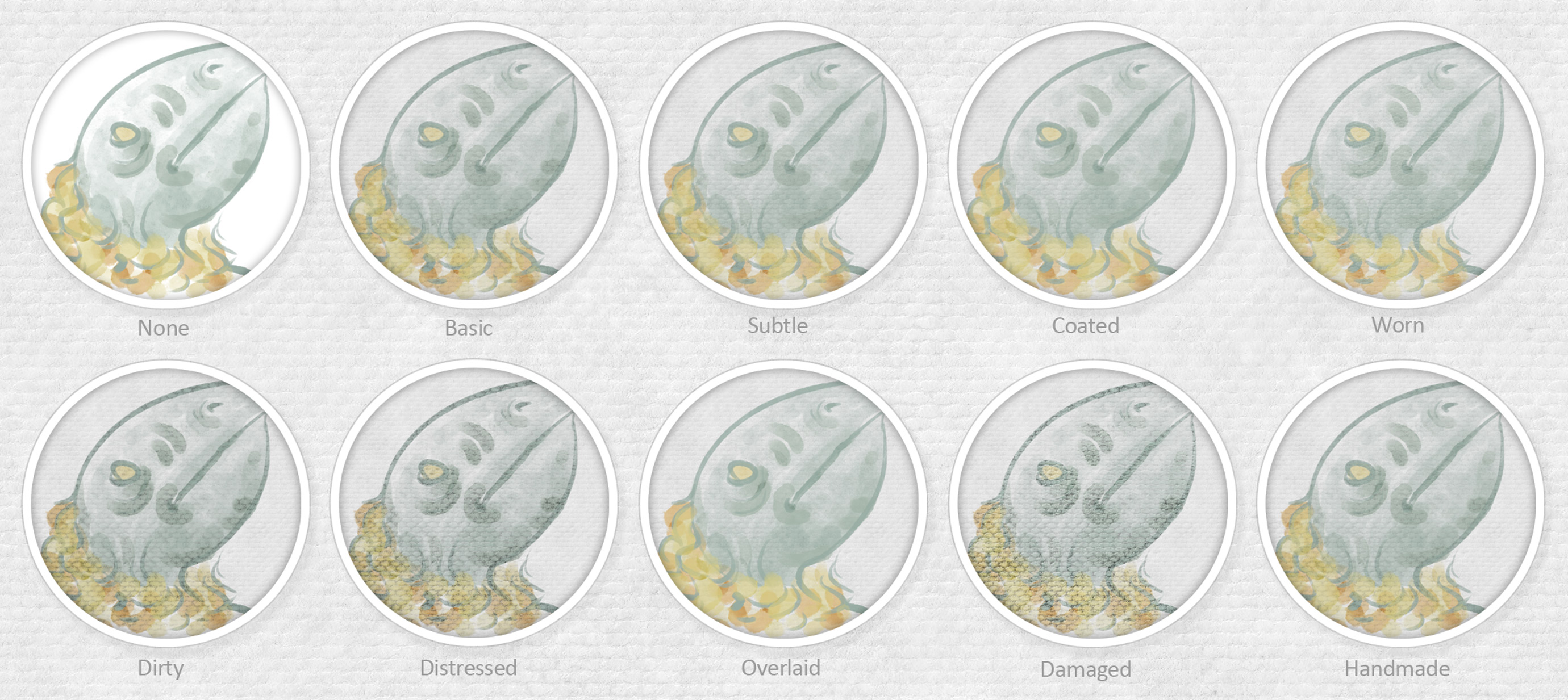 This is an example of what the Art Surface looks like in Photoshop with a painting on it. Each circle shows a different Smart Surface setting applied. The background is the same paper texture at 100% magnification