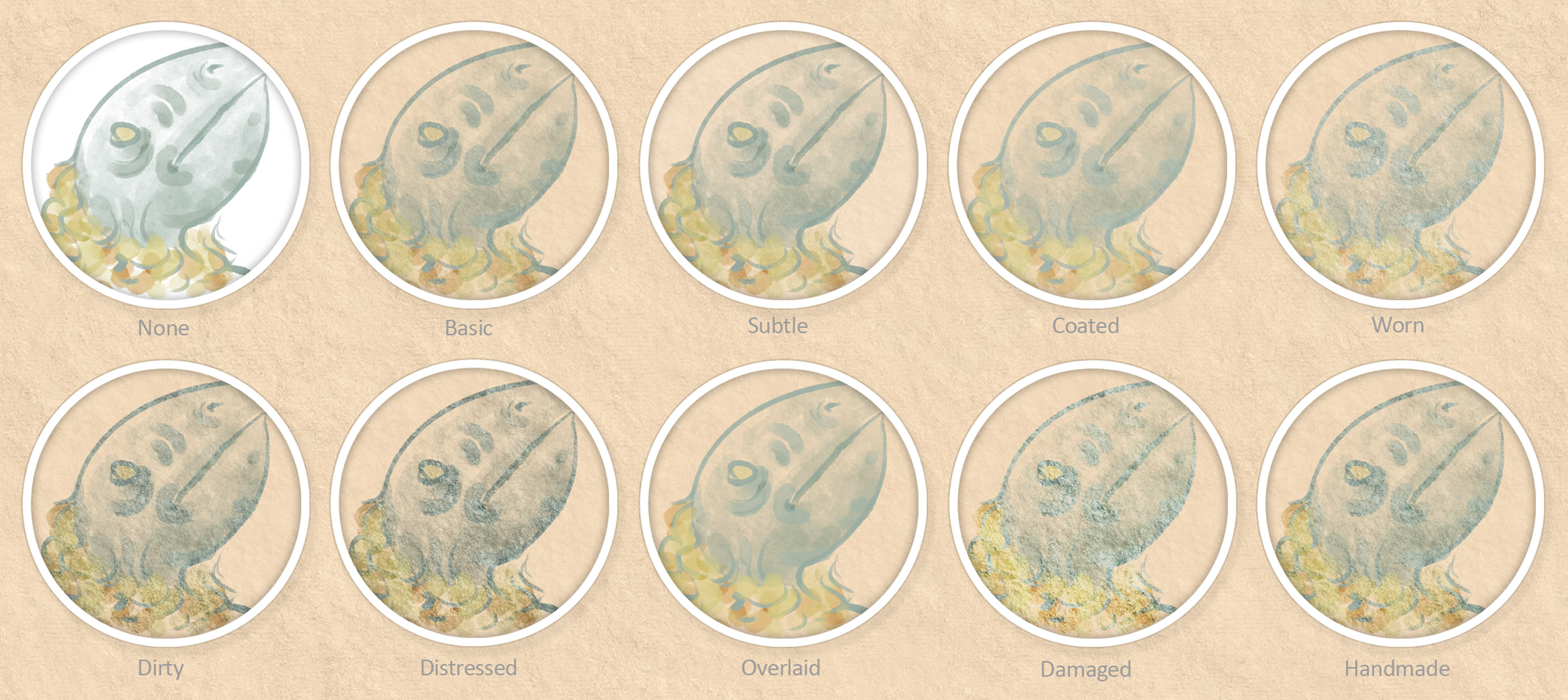 This is an example of what the Art Surface looks like in Photoshop with a painting on it. Each circle shows a different Smart Surface setting applied. The background is the same paper texture at 100% magnification