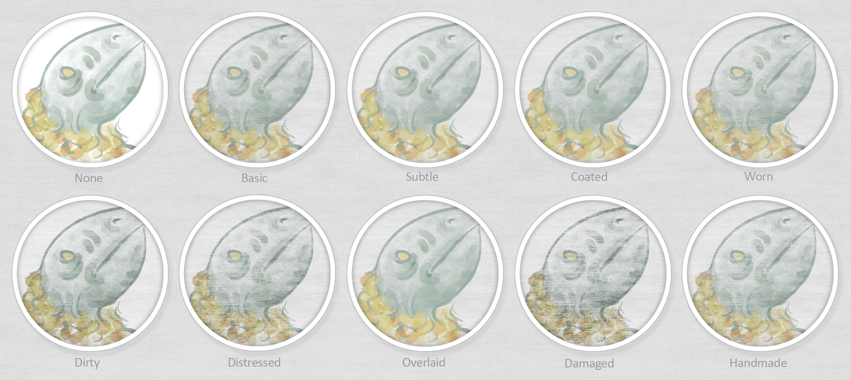 This is an example of what the Art Surface looks like in Photoshop with a painting on it. Each circle shows a different Smart Surface setting applied. The background is the same paper texture at 100% magnification