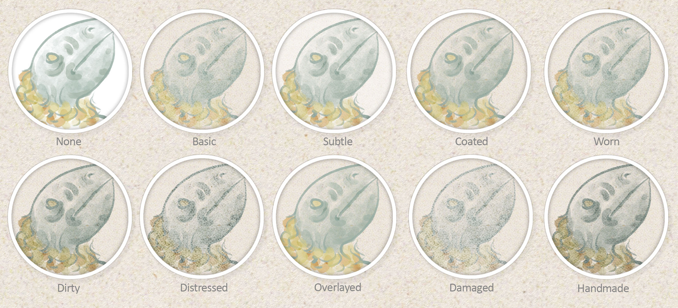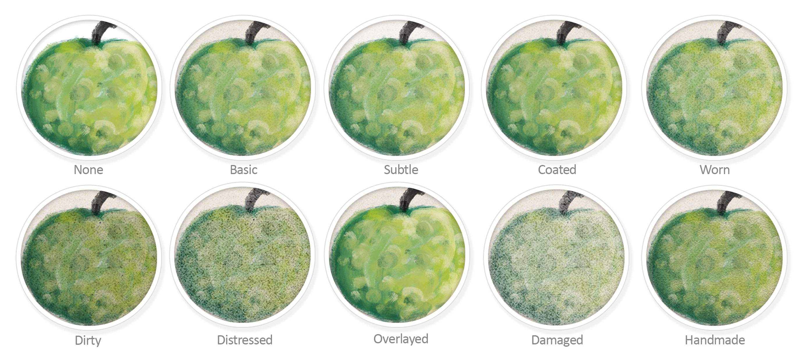 This is an example of what the Art Surface looks like in Photoshop with a painting on it (click/tap to zoom in!) Each circle shows a different Smart Surface setting applied. The background is the same paper texture at 100% magnification