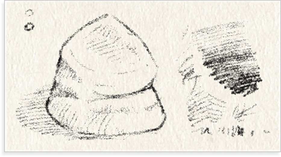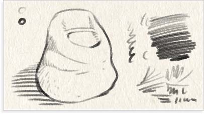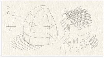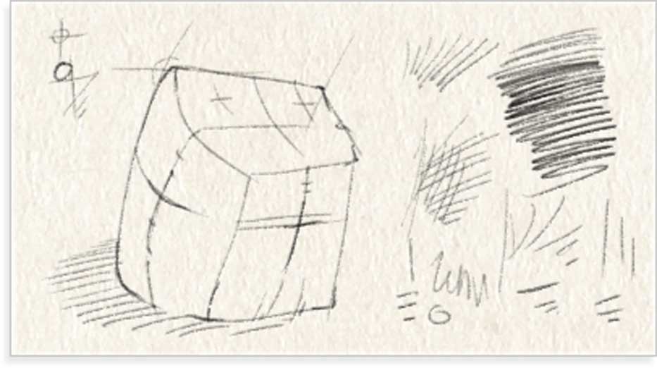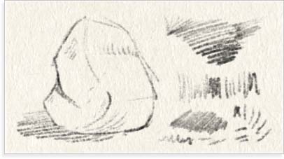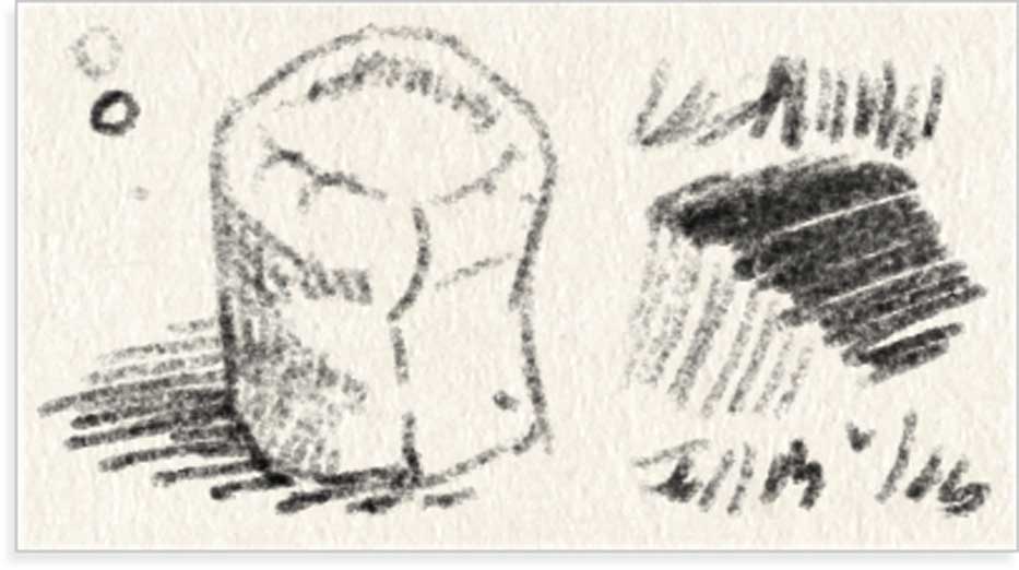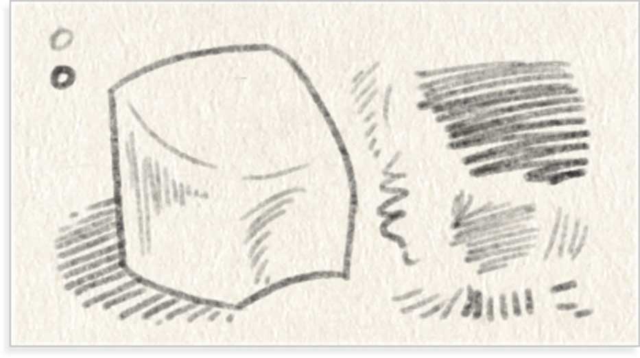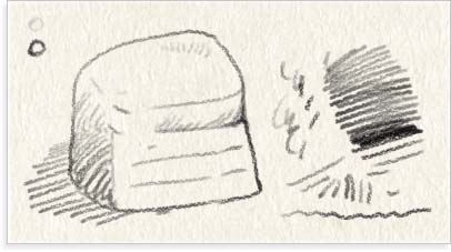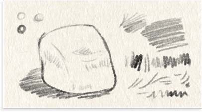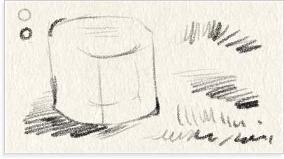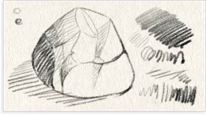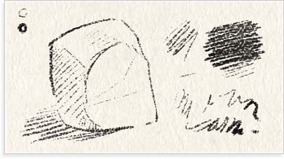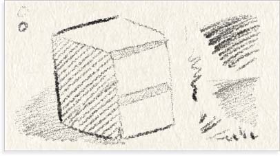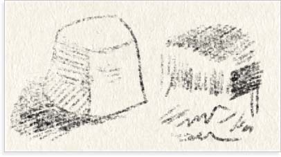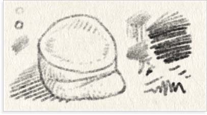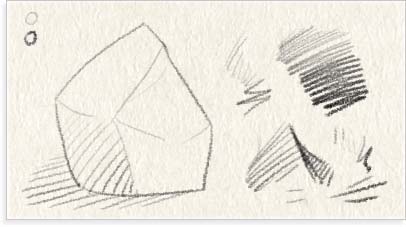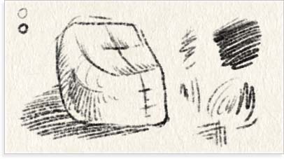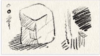 A stark, clumsy pencil with a crumbly texture. While best at broad strokes and defined form building, this pencil is also capable of light hint lines, all of them grainy.