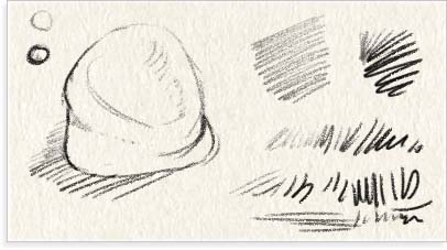 A medium hard pencil for Photoshop that has a noticeably sharp texture and a slightly erratic craggy line but maintains a pleasant and even overall tone. While it can have a fairly dynamic range when pushed, this pencil is a good one when you want to maintain a consistent value within a relatively controlled range.