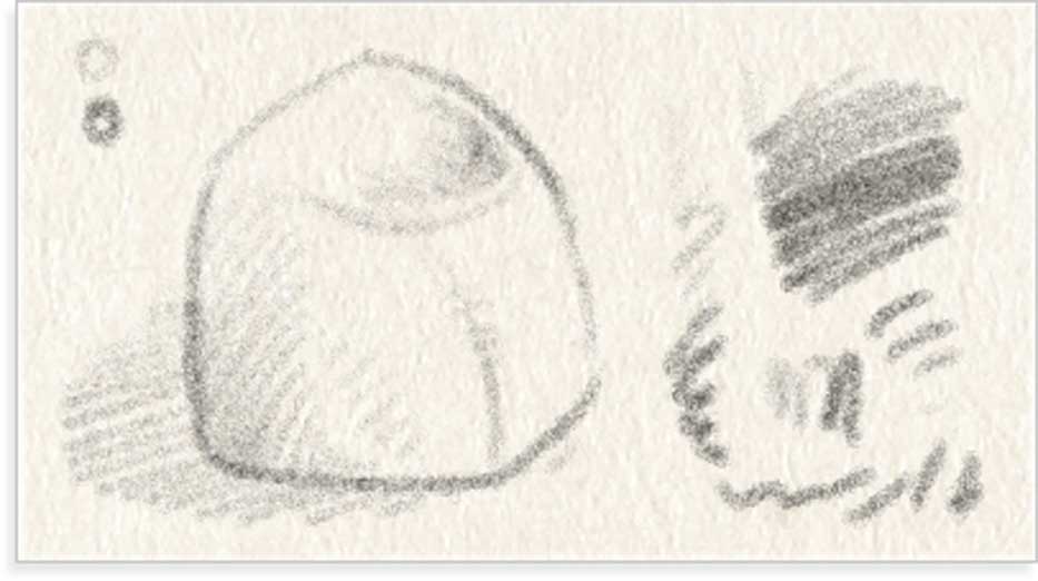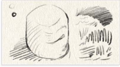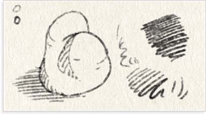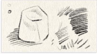 A Soft (2B) pencil which has an intermittent, interrupted line at low pressure which gives it an initial hesitancy when lightly sketching. Bearing down a bit harder on the stylus brings out it’s full bold intentions.