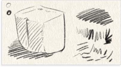 A soft Photoshop pencil with a smooth wax paper-like finish. This pencil lays down a lot of pigment and gives your lines soft powdery edges that feel eminently smudgeable.