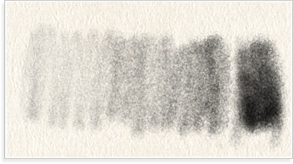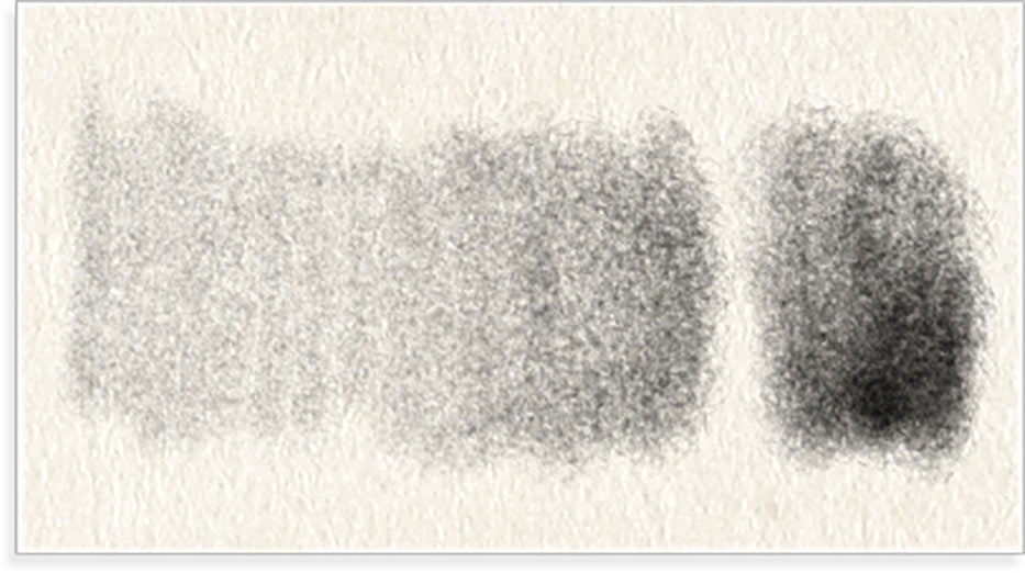 An ultra-soft light toned pencil with equally soft edges. While it does produce a very soft light line at lowest pressure, this brush will quickly ramp up to a dark almost opaque cover pretty quickly. This flexibility makes it suitable for both light shading as well as casual draft sketching.