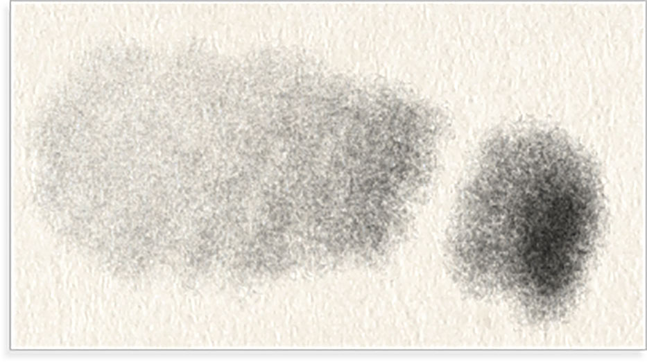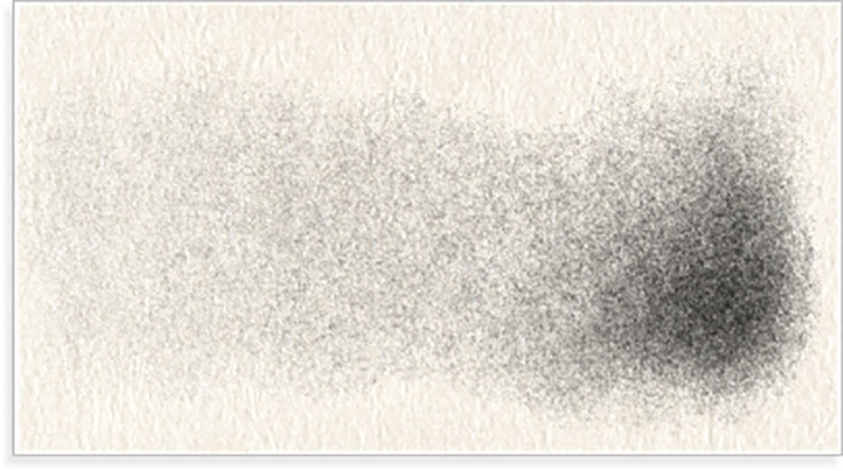 A Soft bold pencil with a sharp powdery line. This dark brush has the occasional impurity giving it a few randomly spaced flaws that in the real world are caused by hard deposits in the graphite pencil ‘lead’