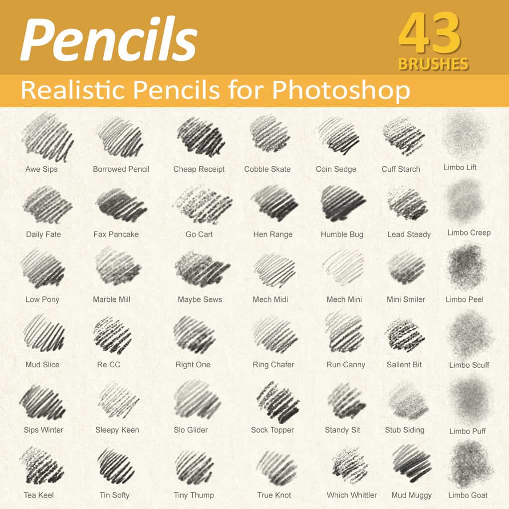 43 (x2) Photoshop Pencils for digital drawing Realistic, pressure responsive Photoshop pencil set for of all types drawing. Including soft, medium and hard pencils in both web and high res/print resolution versions.