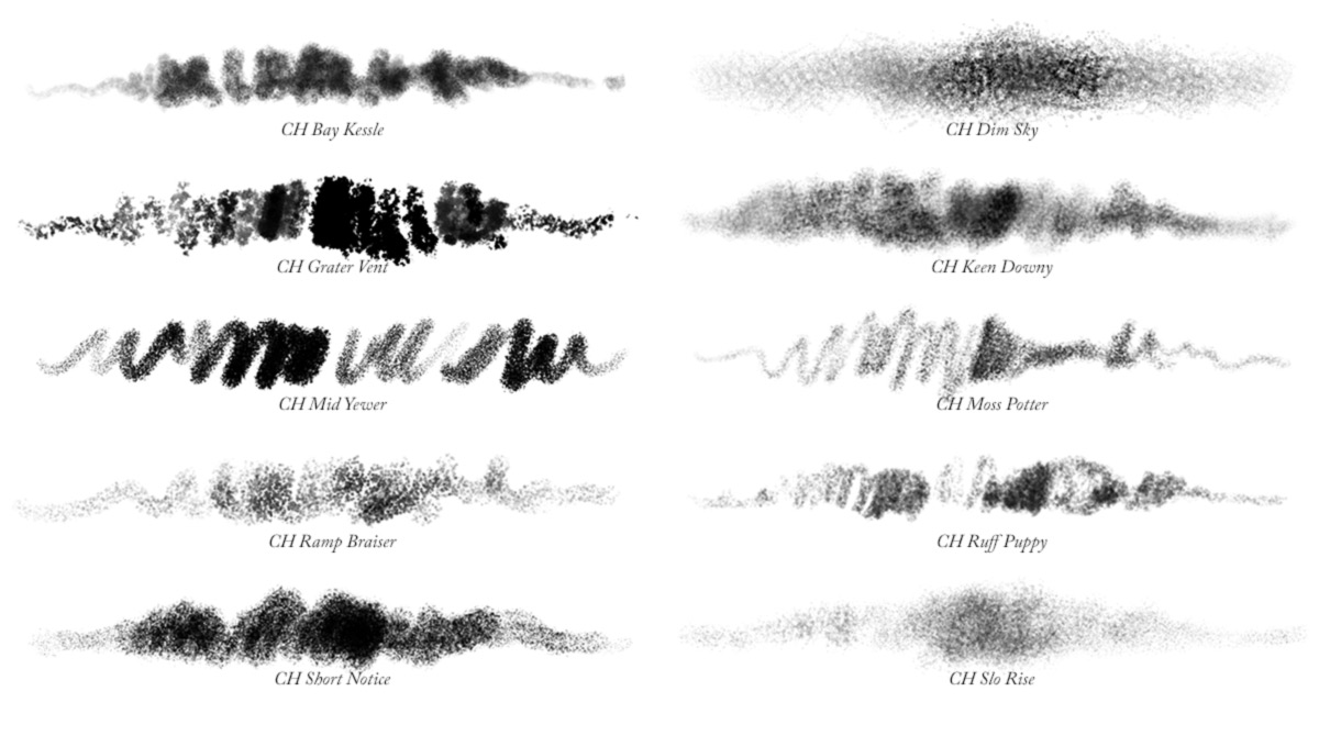 Brush Stroke samples of all 10 Photoshop charcoal brushes