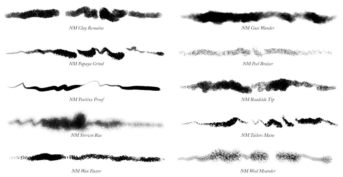 Brush Stroke samples drawn using the 10 Brushes in the Natural Media 01 set