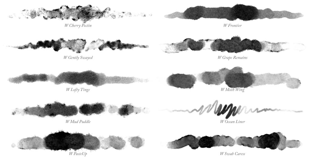 Brush Strokes of all 10 Photoshop watercolour brushes in Waters 01 collection